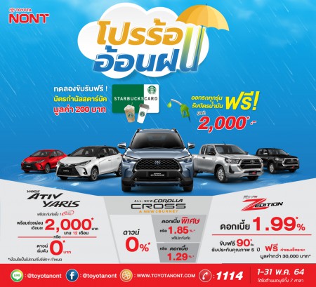 โปรร้อน…อ้อนฝน !! ออกรถทุกรุ่นวันนี้ รับฟรี! บัตรเติมน้ำมันมูลค่า 2,000* บาท พิเศษ!! พบโปรแรงพร้อมข้อเสนอสุดพิเศษ ก่อนใคร New Hilux Revo • ดอกเบี้ยพิเศษ 1.99% พร้อมขับฟรี 90 วัน • รับประกันคุณภาพ 5 ปี ฟรีค่าแรงเช็กระยะ มูลค่ากว่า 30,000 บาท NEW ATIV & NEW YARIS • ฟรี ประกันภัยชั้น 1 Toyota Care พร้อม ช่วยผ่อนเดือนละ 2,000 บาท นาน 12 เดือน • ดาวน์เริ่มต้น 0 บาท All-New Corolla Cross • ดาวน์ 0%* • หรือรับฟรี ประกันภัยชั้น 1 Toyota Care พร้อมดอกเบี้ย 1.85%* • หรือเลือกรับ ดอกเบี้ยพิเศษเพียง 1.29%* *เงื่อนไขเป็นไปตามที่บริษัทกำหนด 1-31 พ.ค.64 สนใจทดลองขับรับฟรี ! บัตรกำนัลสตาร์บัค มูลค่า 200 บาท คลิกเลย! https://rebrand.ly/kczih3b สอบถามรายละเอียดเพิ่มเติมได้ที่โตโยต้านนทบุรีทุกสาขาโทร 1114 หรือคลิก M.me/toyotanont
